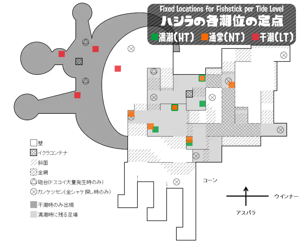 柱の刺さる地点はステージ・潮位ごとにそれぞれ決まっており、1WAVEにつき3本までしかフィールドに刺さらない。