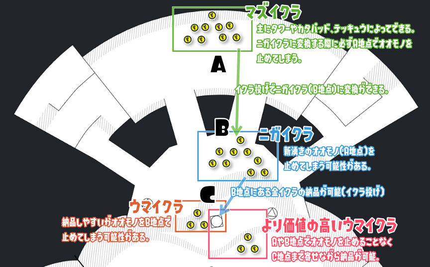 今作から追加されたイクラ投げのおかげでニガイクラ(イクラ投げが必要な距離感の金イクラ)でも納品ができるため、「寄せ」の概念や難易度が緩和された。