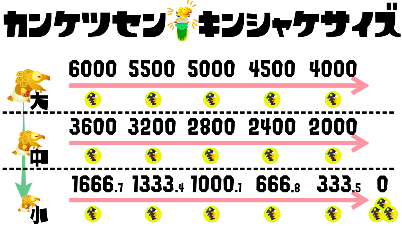 キンシャケはHPが減ると大きさと移動速度が三段階に変化するが、どれだけダメージを与えれば金イクラをドロップするかなどは検証されて厳密な値がわかっている。