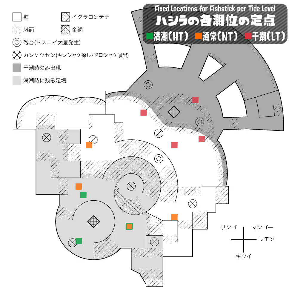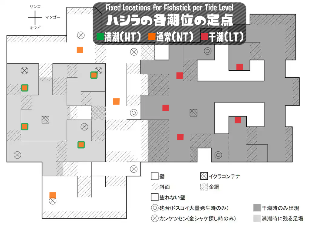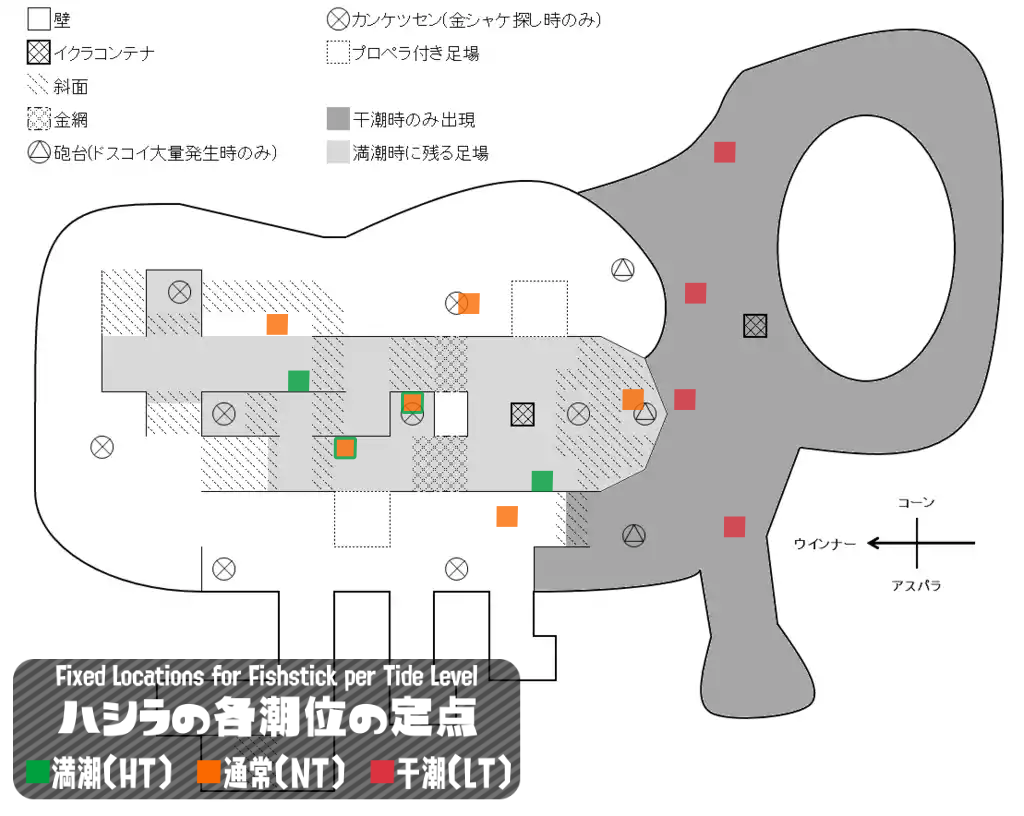 柱の刺さる地点はステージ・潮位ごとにそれぞれ決まっており、1WAVEにつき3本までしかフィールドに刺さらない。