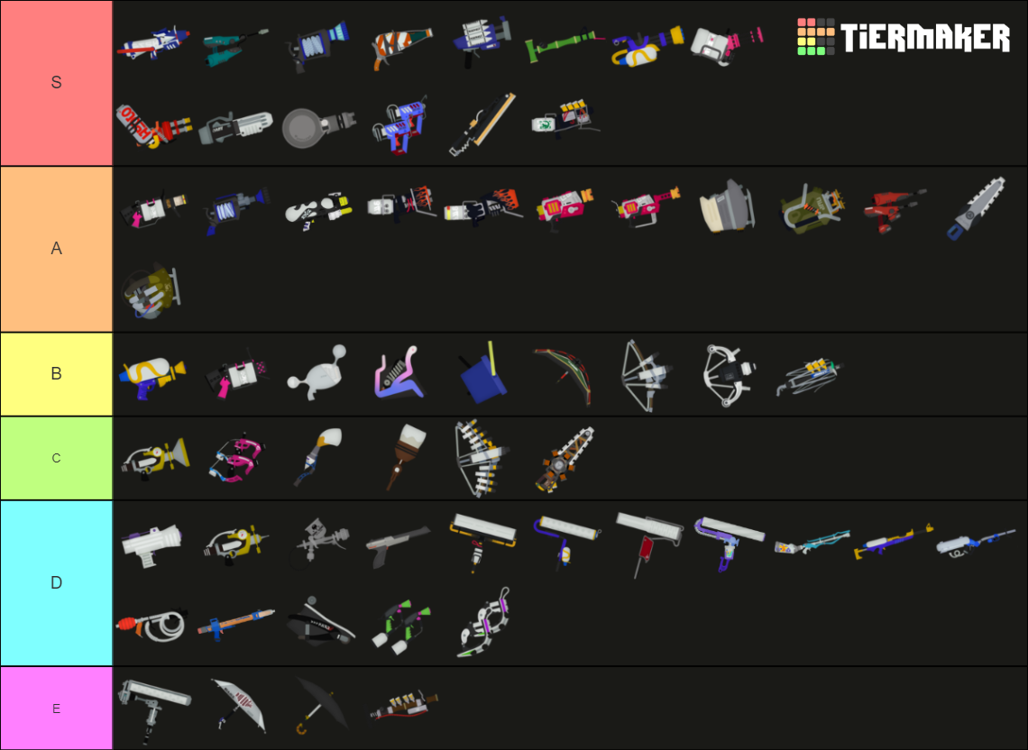 クマサン印のチャージャーは本来Aランクに属するブキだが、連続で最大7発までしか撃てない点、他の仕事をした方が貢献度が高い点から味方に任せたいEランクに含まれる。